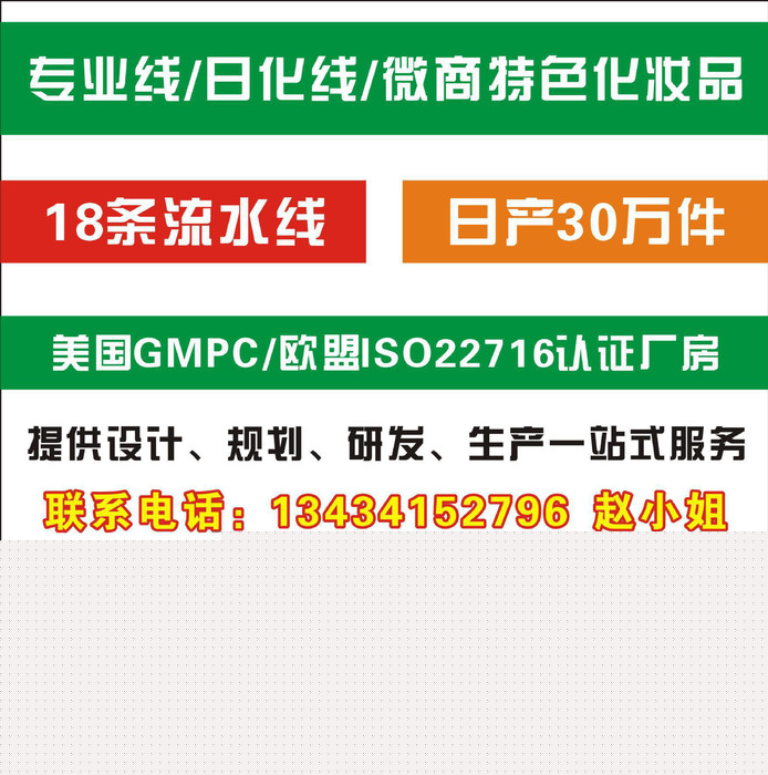 广 州博今生物科技有限公司专业承接国内外化妆品OEM/ODM加工,具备了过硬的质量鉴定标准和能力,始终视产品质量为生命。多年以来,我们成功地为众多合 作伙伴打造出一个又一个富有市场竞争力的品牌,为众多代理公司提供一个又一个新颖、独特的卖点,创造了无限商机;多年以来,我们一直在努力攻关的产品方向 如下: